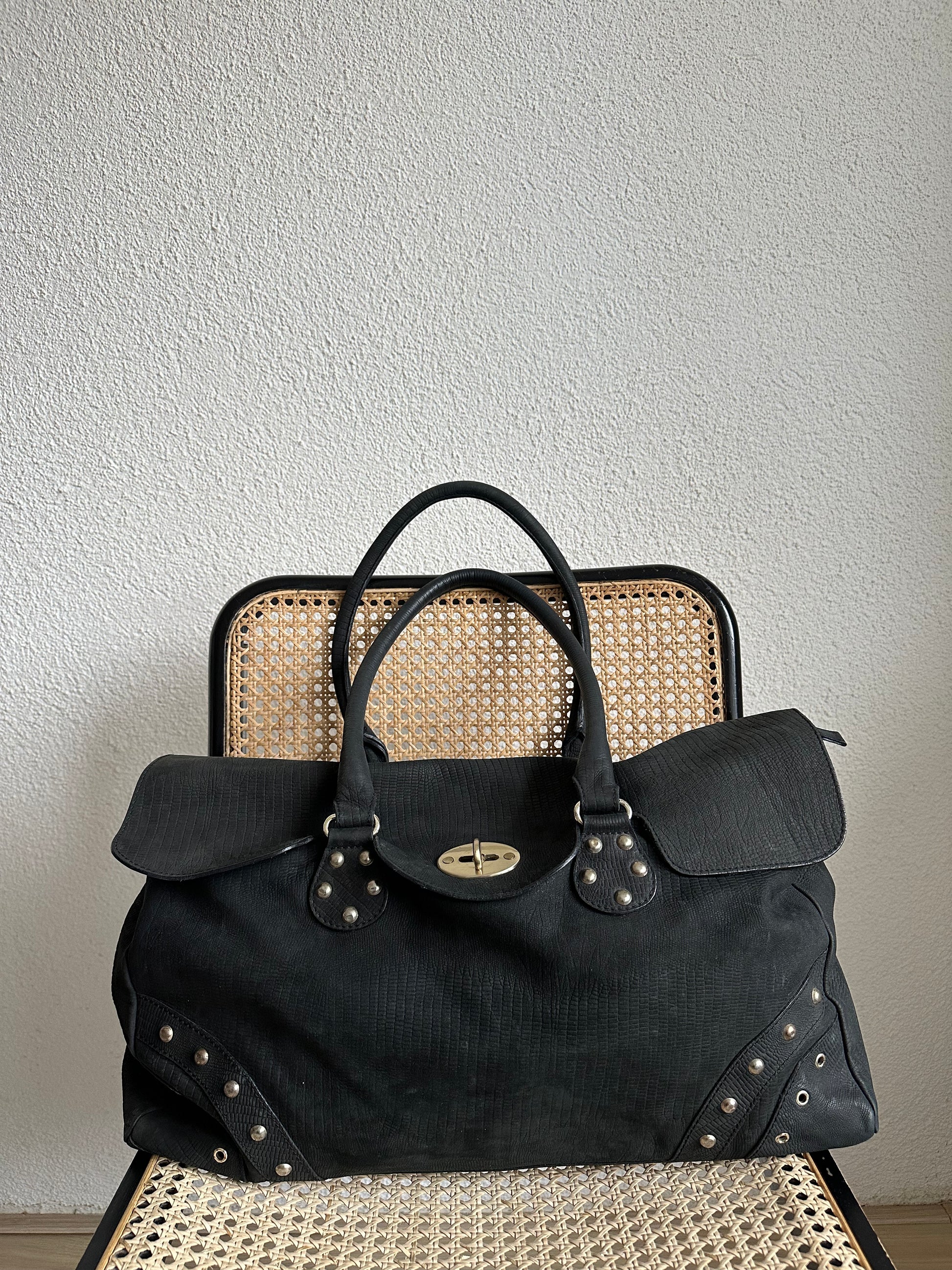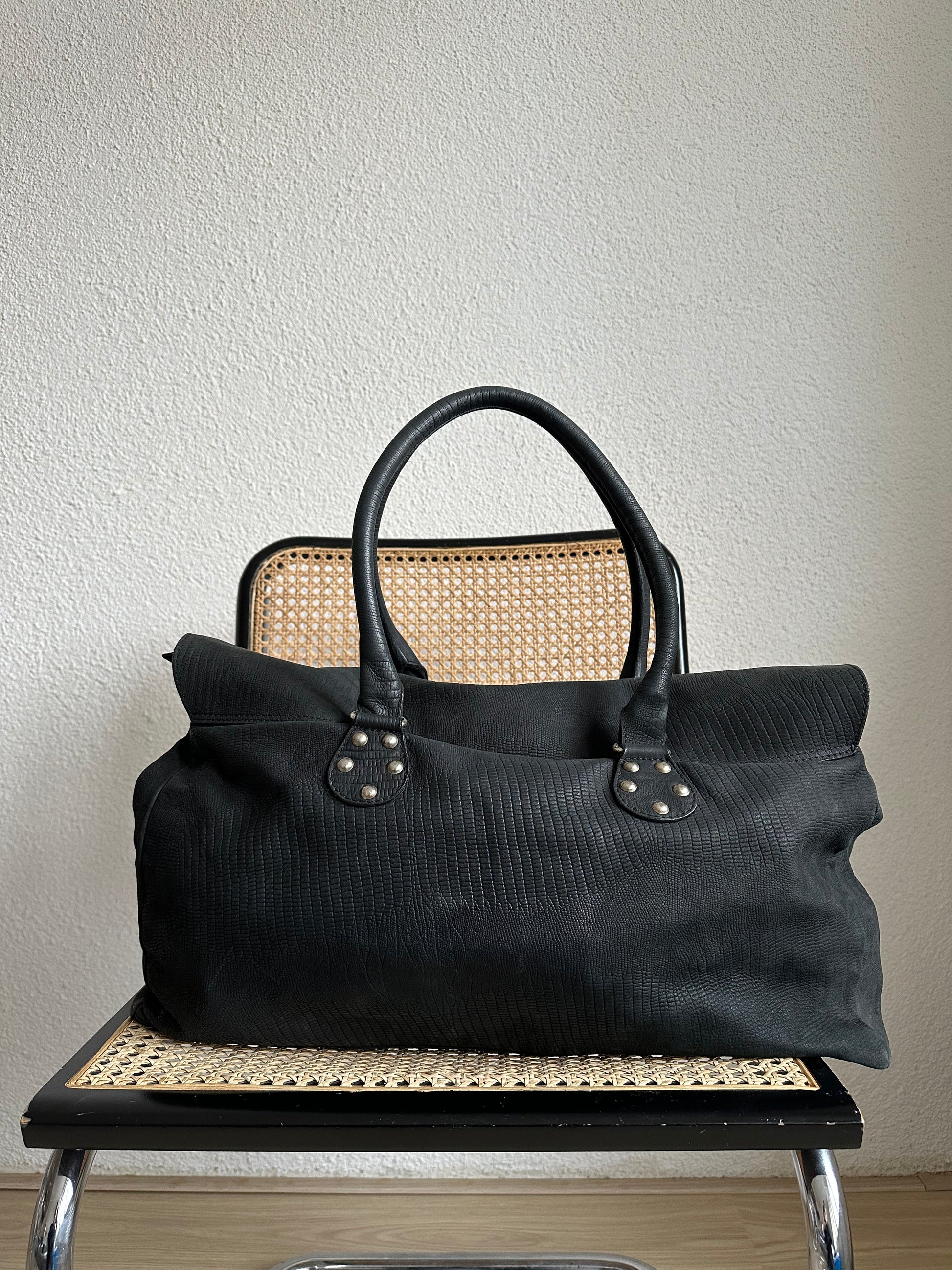 The structured leather combined with gold-tone hardware gives it a slightly edgy yet classic feel. A pre-loved leather weekend bag like this only gets more beautiful over time as the leather develops natural character. Perfect for anyone looking for a black leather travel bag, studded leather weekend bag or timeless statement accessory.
