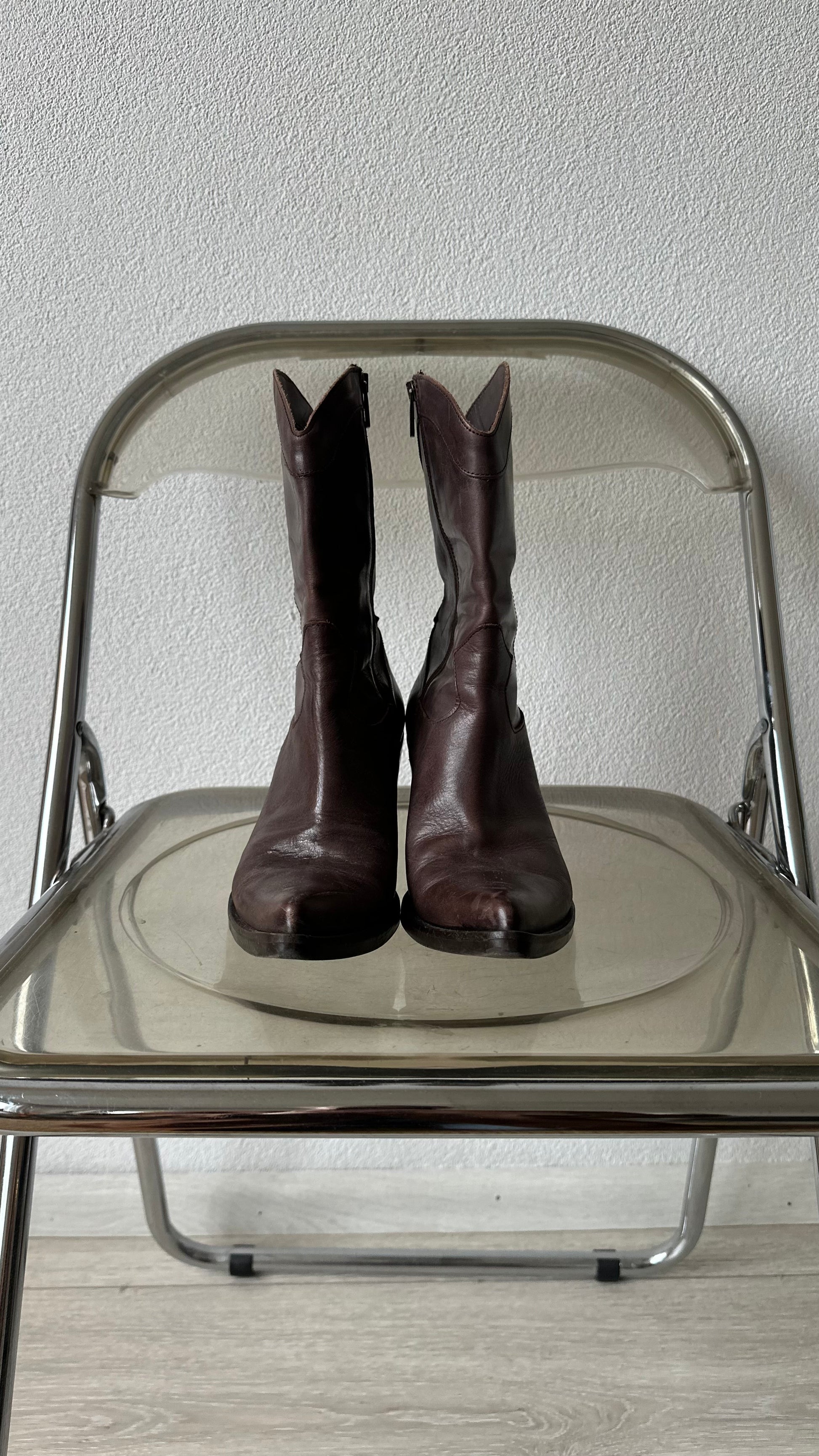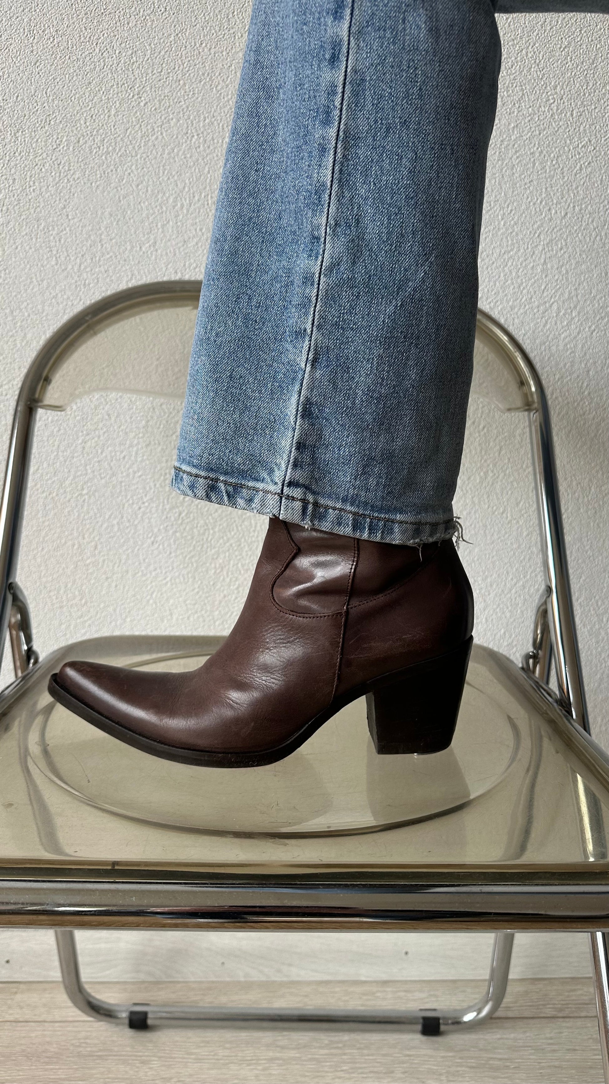 The warm walnut tone feels rich and lived in, with subtle markings that show their story without taking away from their elegance. The pointed toe and inward zipper create a clean silhouette, while the silver patch under the heel protects against wear and adds a hint of vintage charm. Pair them with straight denim, a midi skirt, or a long wool coat for an understated but confident look.