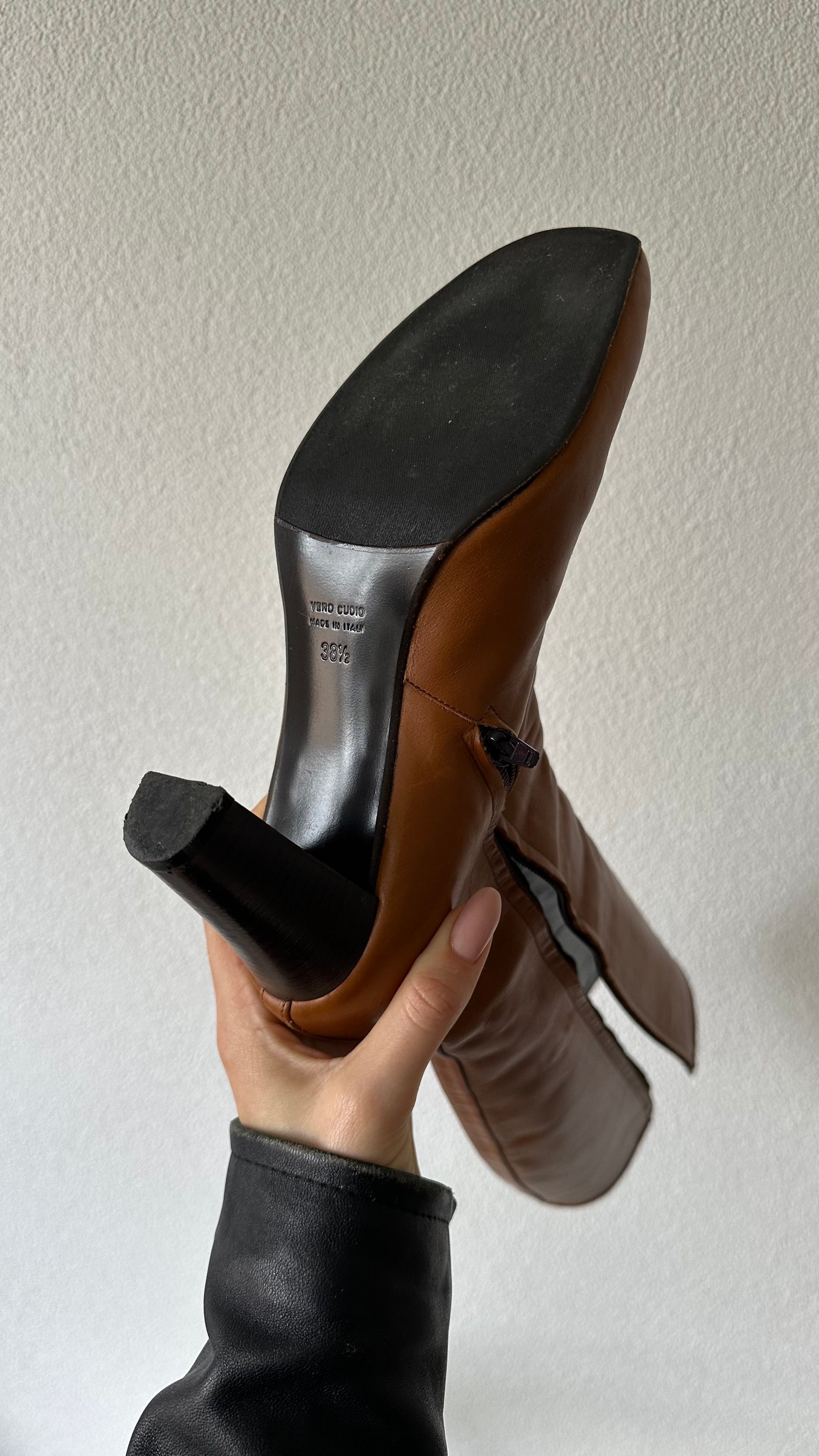 Crafted from beautifully aged leather that feels soft yet structured, they feature an inside zipper for an easy fit and a comfortable heel that makes them perfect for everyday wear. The warm camel tone adds a sense of understated luxury and pairs effortlessly with everything from straight-leg jeans to long skirts and flowy dresses. Subtle signs of wear tell a story of quality craftsmanship and timeless design.