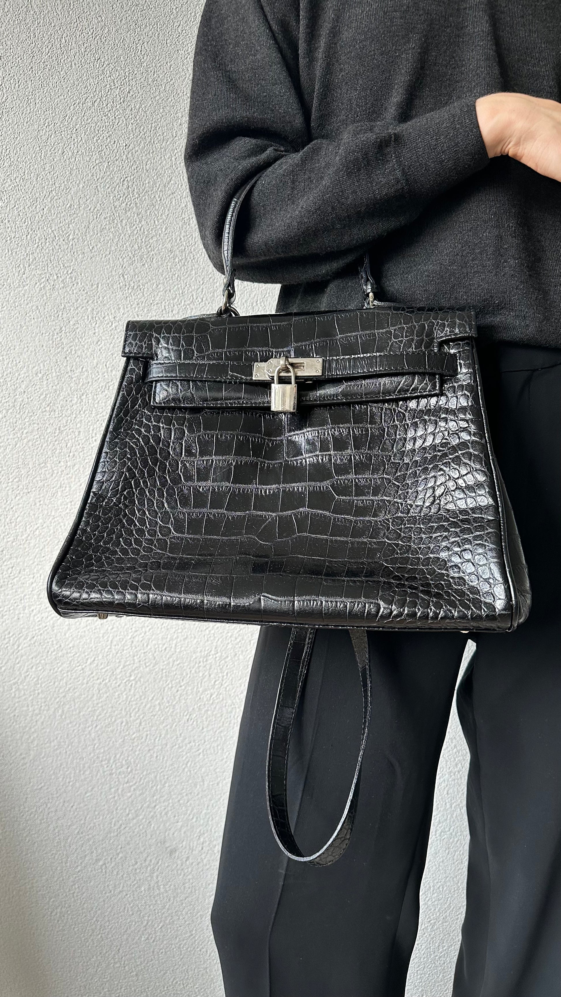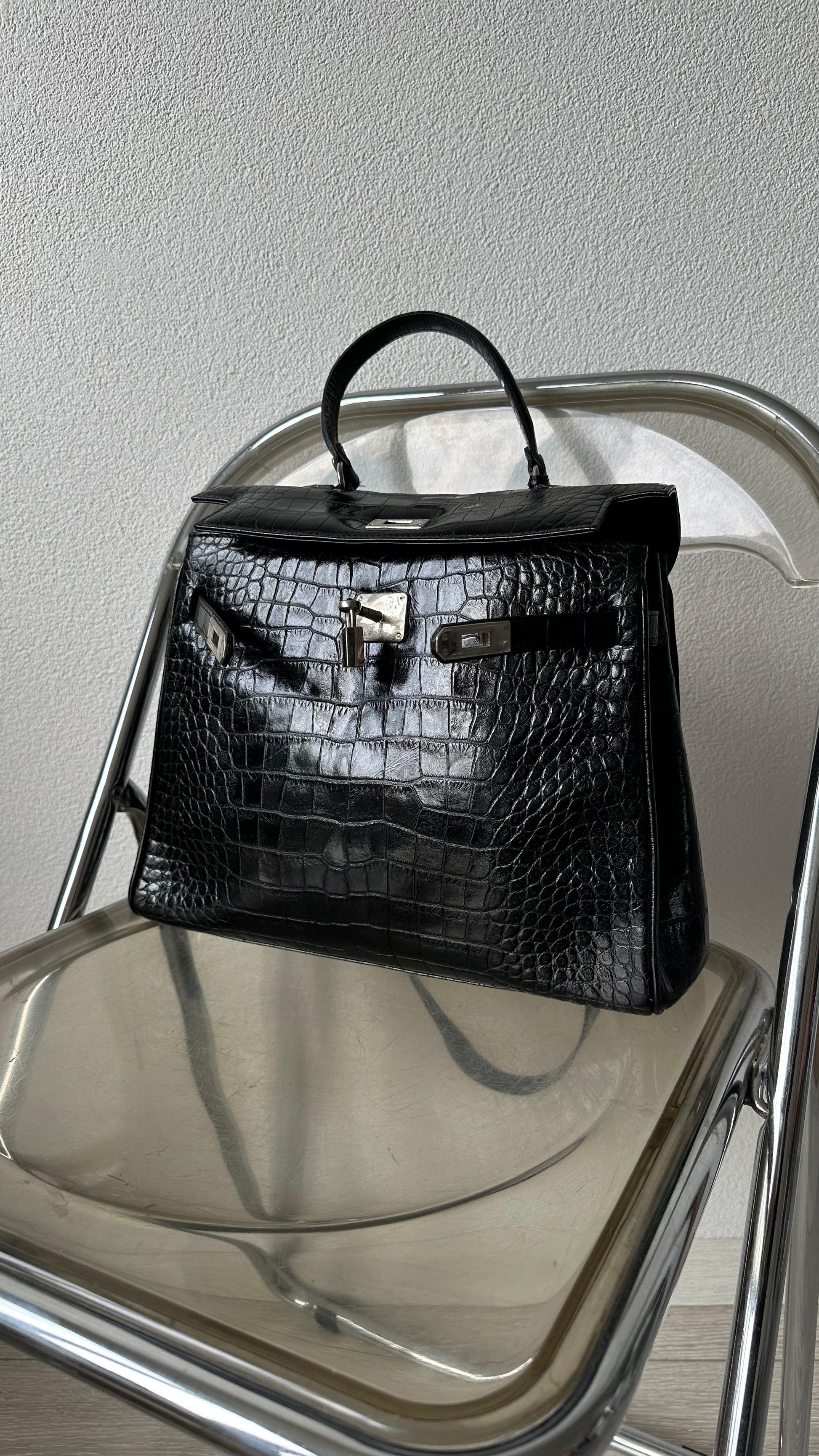 This black croco leather bag by Pañalva Madrid is a true vintage treasure. The structured Birkin style silhouette gives it a luxurious edge, while the intricate croco texture adds depth and detail. Known for their collaborations with renowned fashion houses, Pañalva designs combine traditional techniques with timeless elegance. The bag features a small key and lock detail, a signature touch that nods to its heritage and quality. Despite its age, the leather feels strong and supple, showing the lasting beauty of well made pieces.