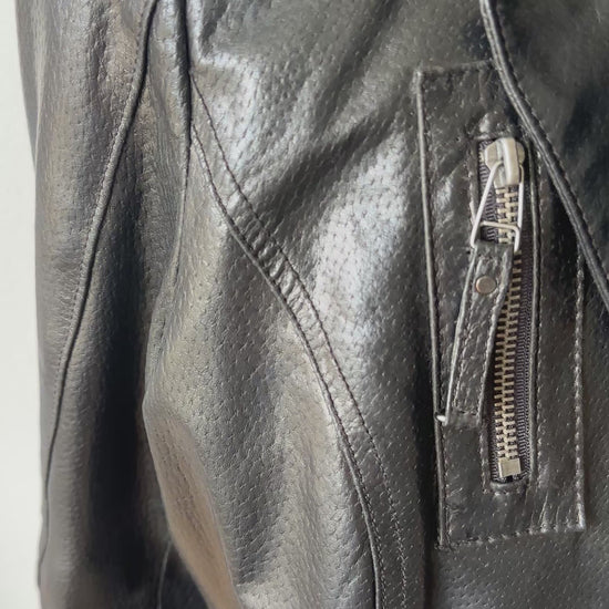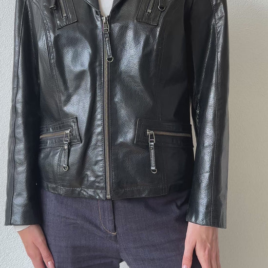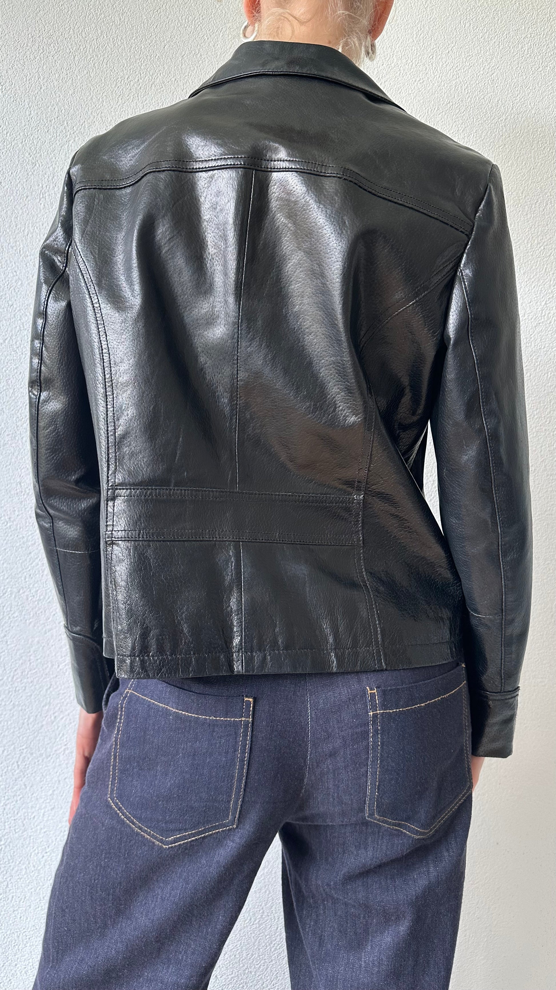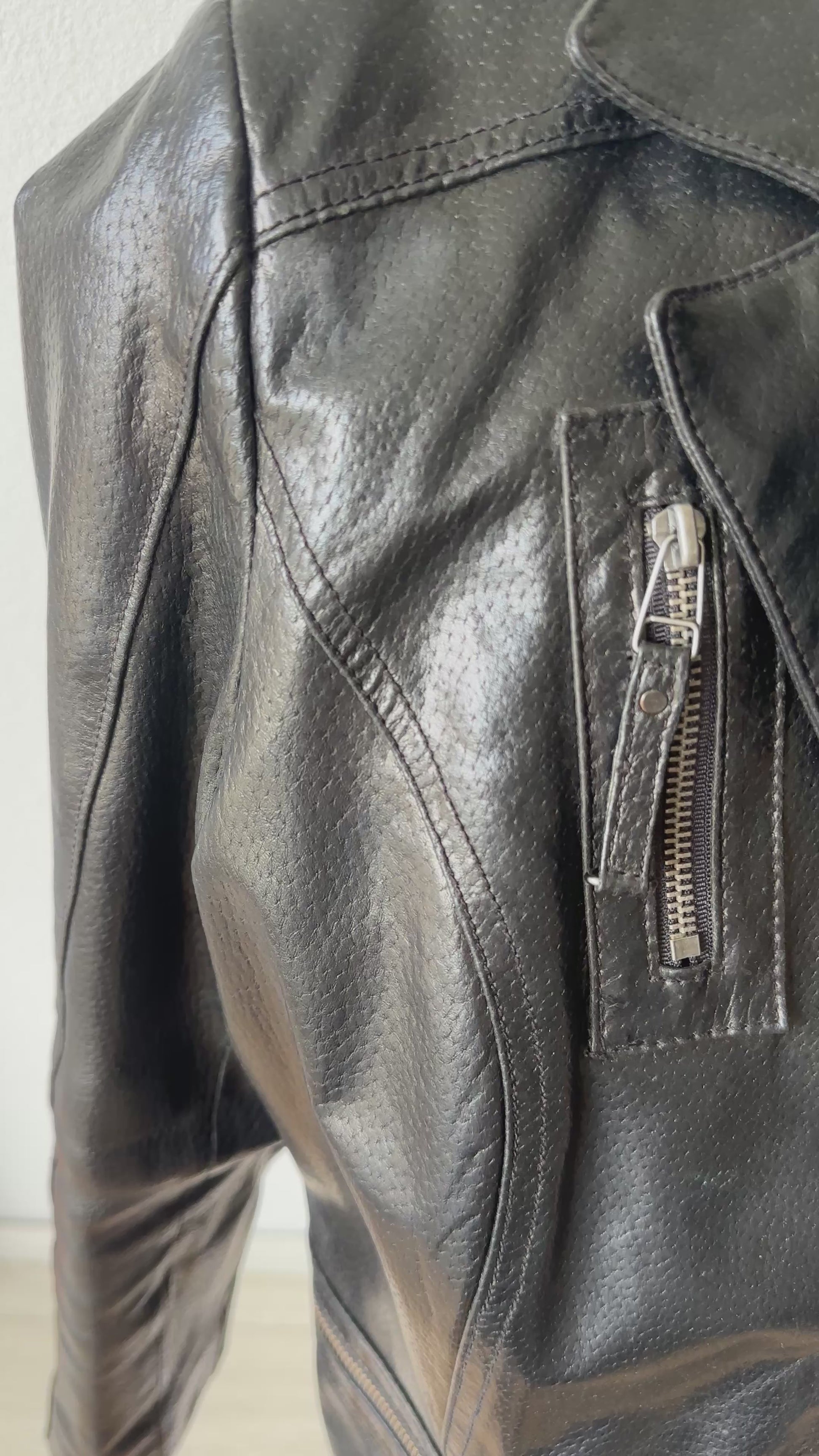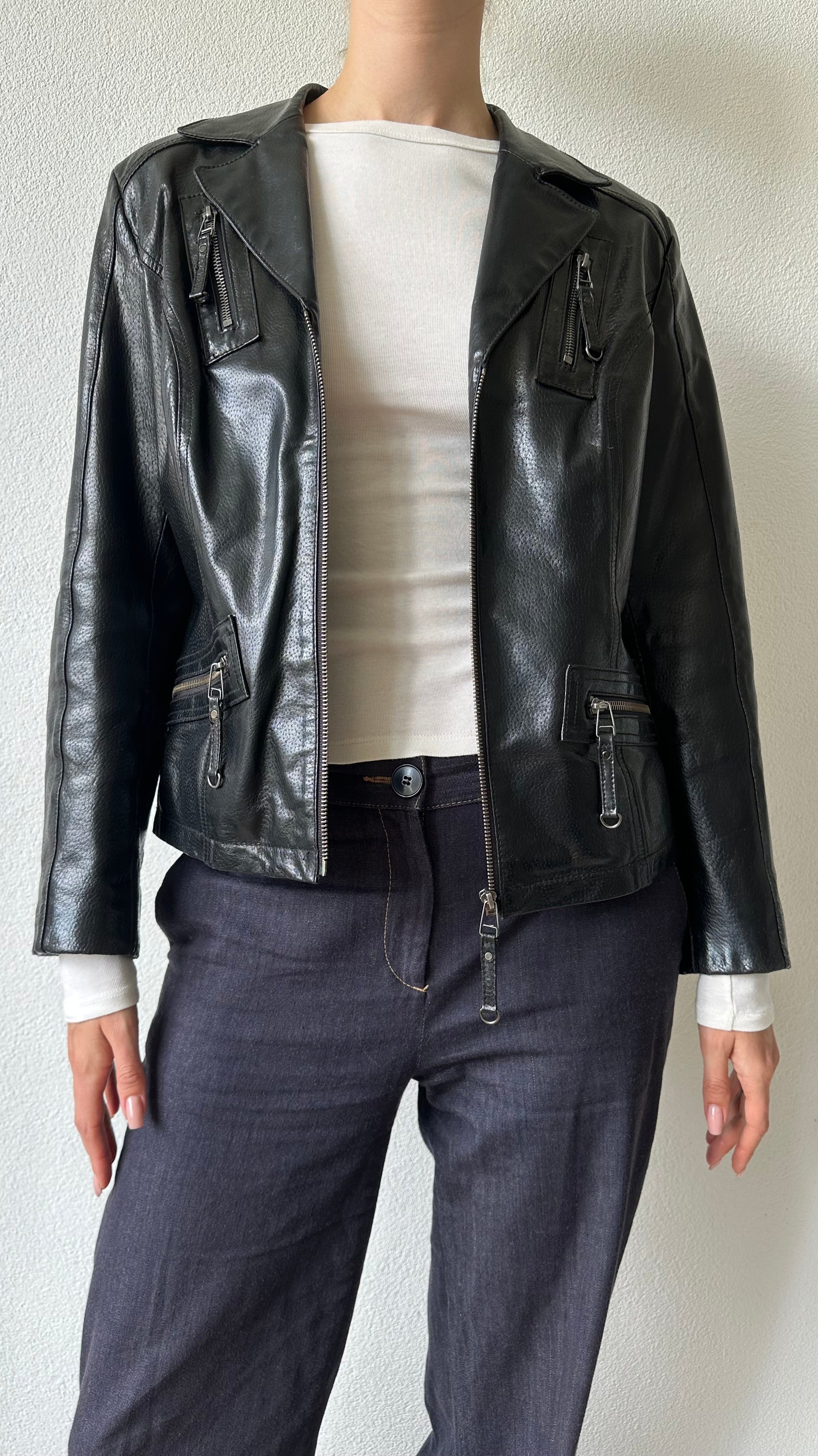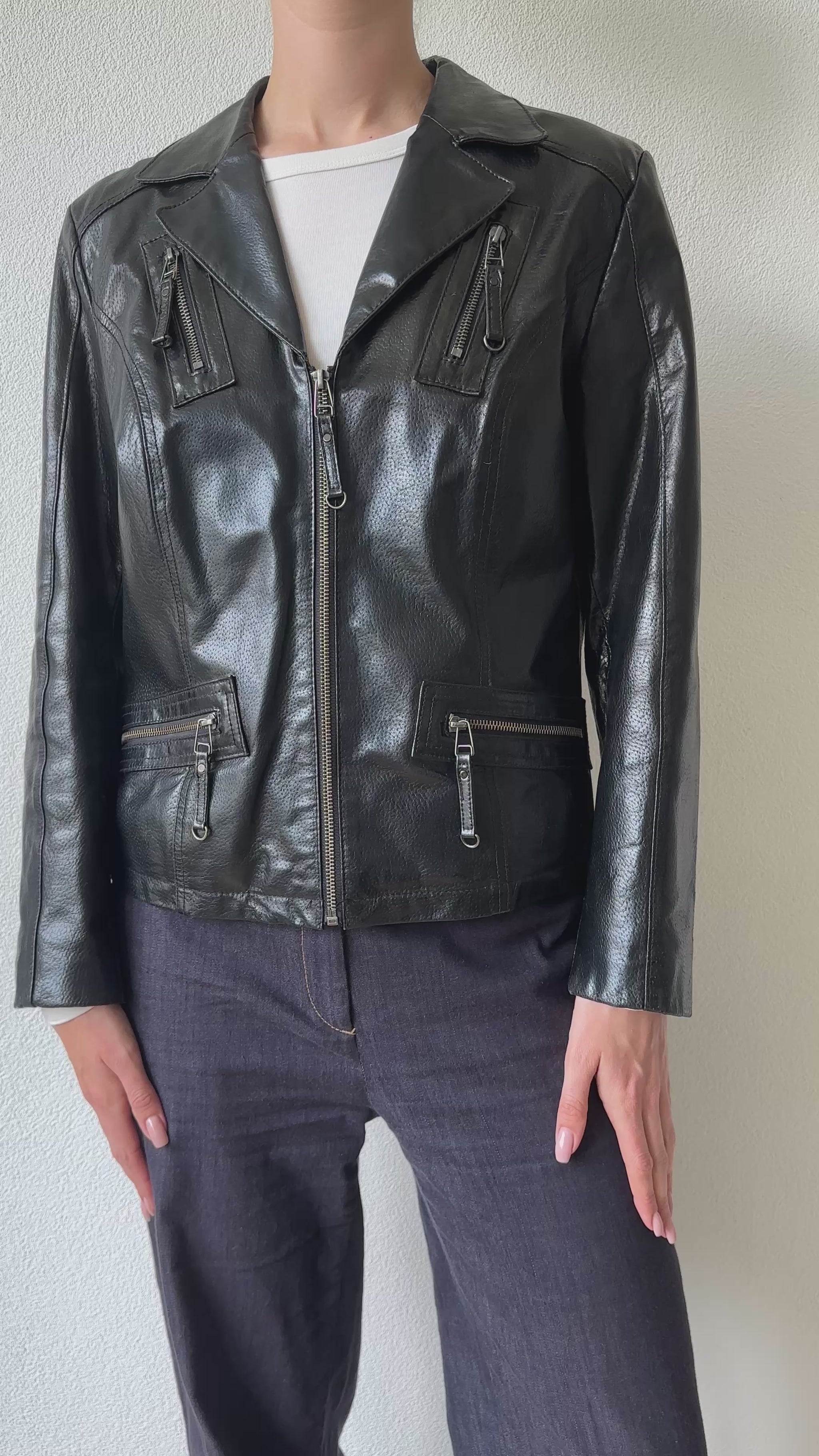 The leather has a subtle shine that catches the light without being too glossy, making it easy to dress up or down. Four zippered pockets at the front give it a structured, slightly utilitarian edge while still keeping it effortlessly cool. The fit is relaxed yet flattering, offering enough room to layer over chunky knits in winter or a simple tee in spring.
