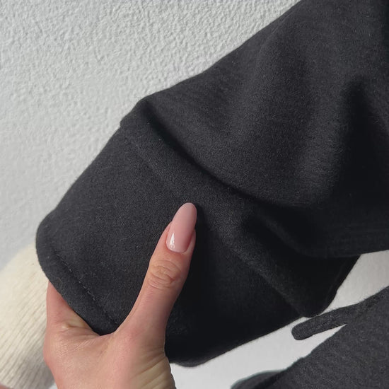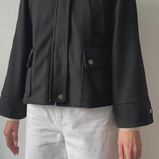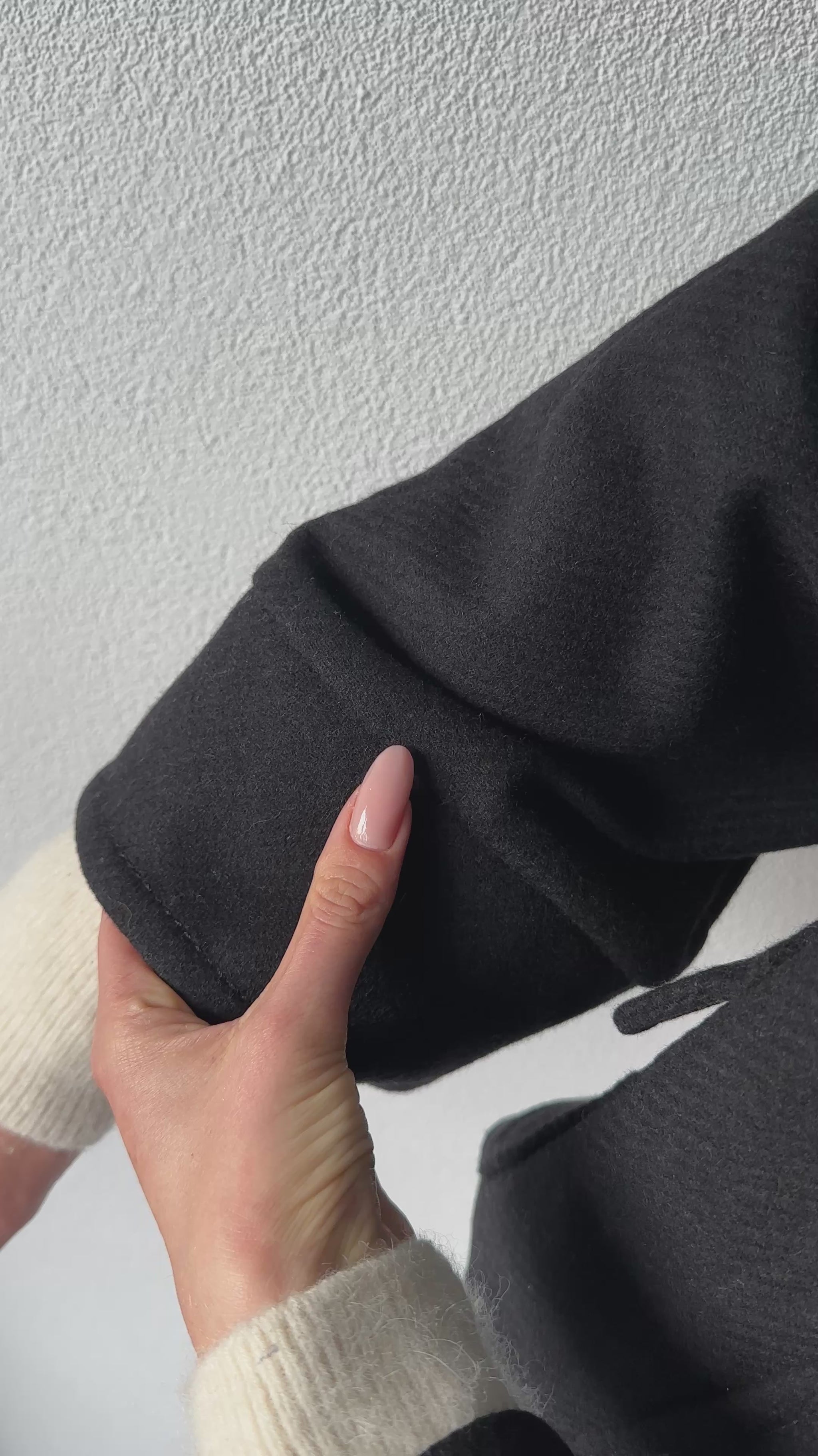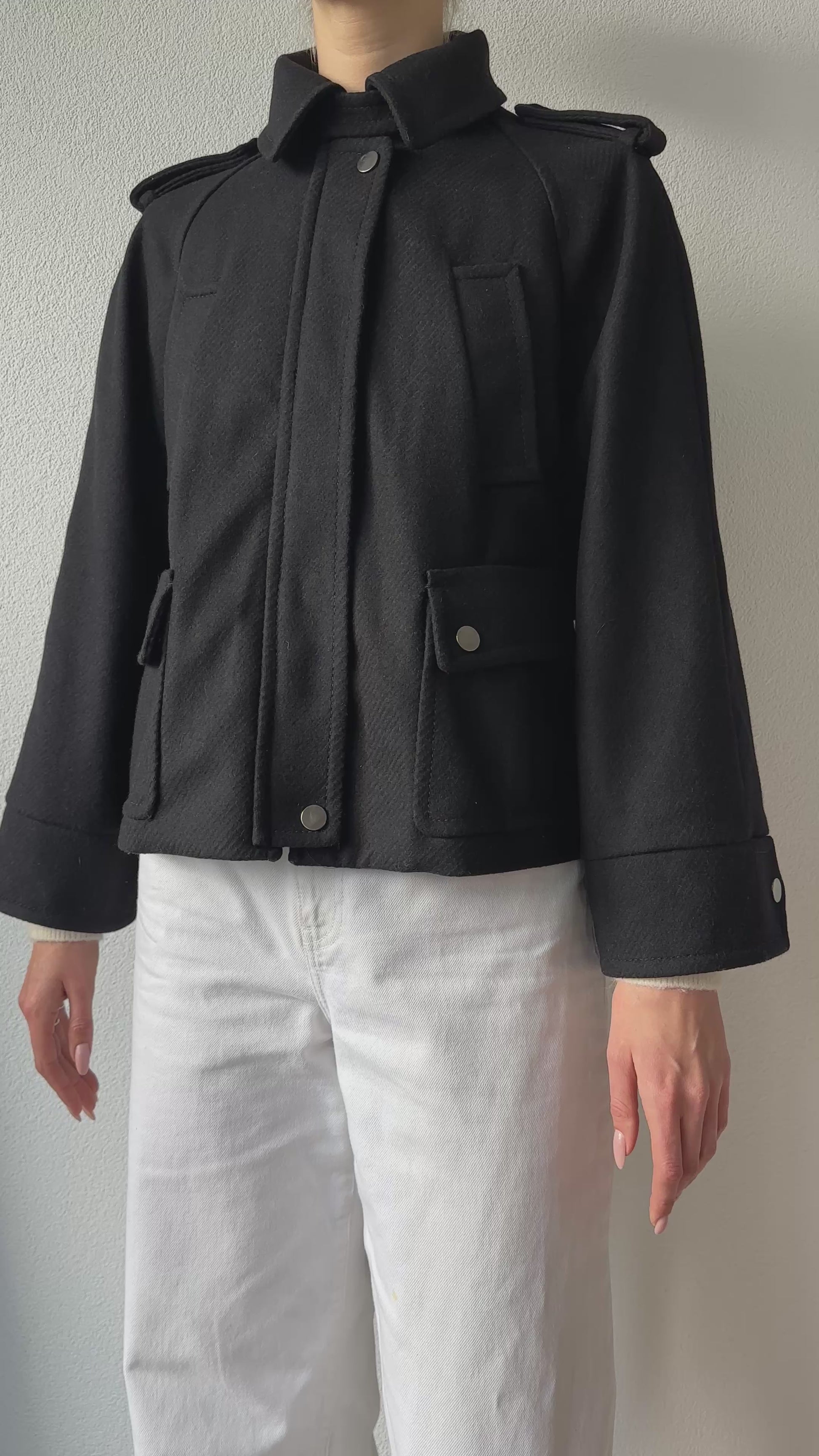 The soft wool blend feels luxurious while keeping you warm without the weight of a heavy winter coat. The raglan sleeves create a natural, relaxed shape that moves beautifully with the body, making it feel effortless to wear. The short cut gives it a modern look, perfect for layering over trousers, dresses, or skirts. The classic black color makes it endlessly versatile, while the details give it that elevated, quiet luxury feel that never goes out of style.
