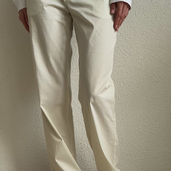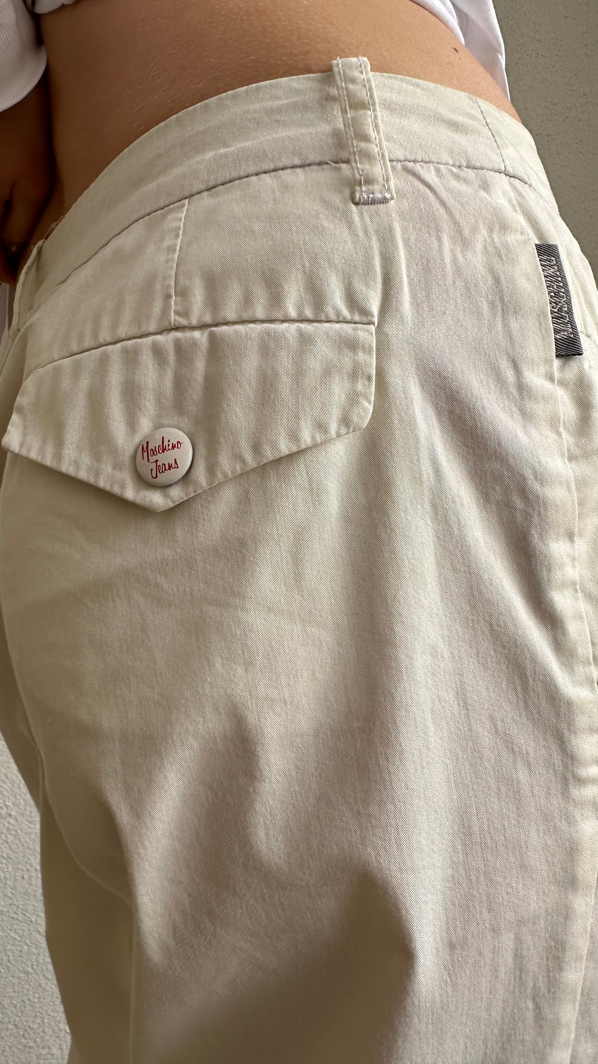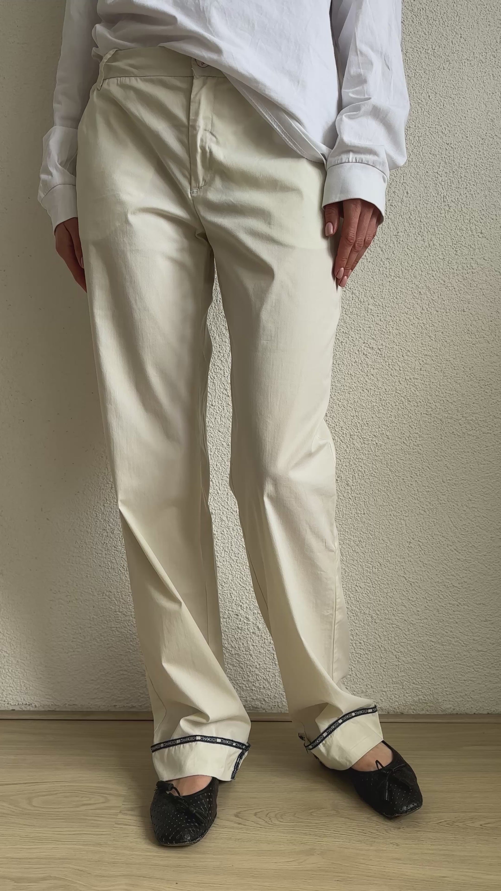 These vintage Moschino pants are all about subtle statement. The off-white shade keeps them clean and timeless, while the folded bottoms with the Moschino monogram add that unexpected detail that makes them stand out.