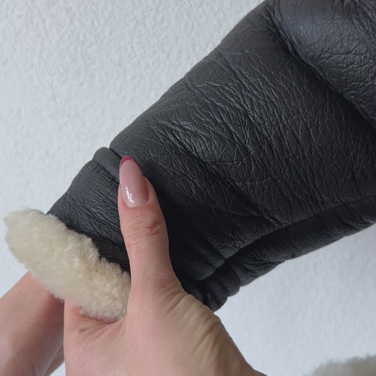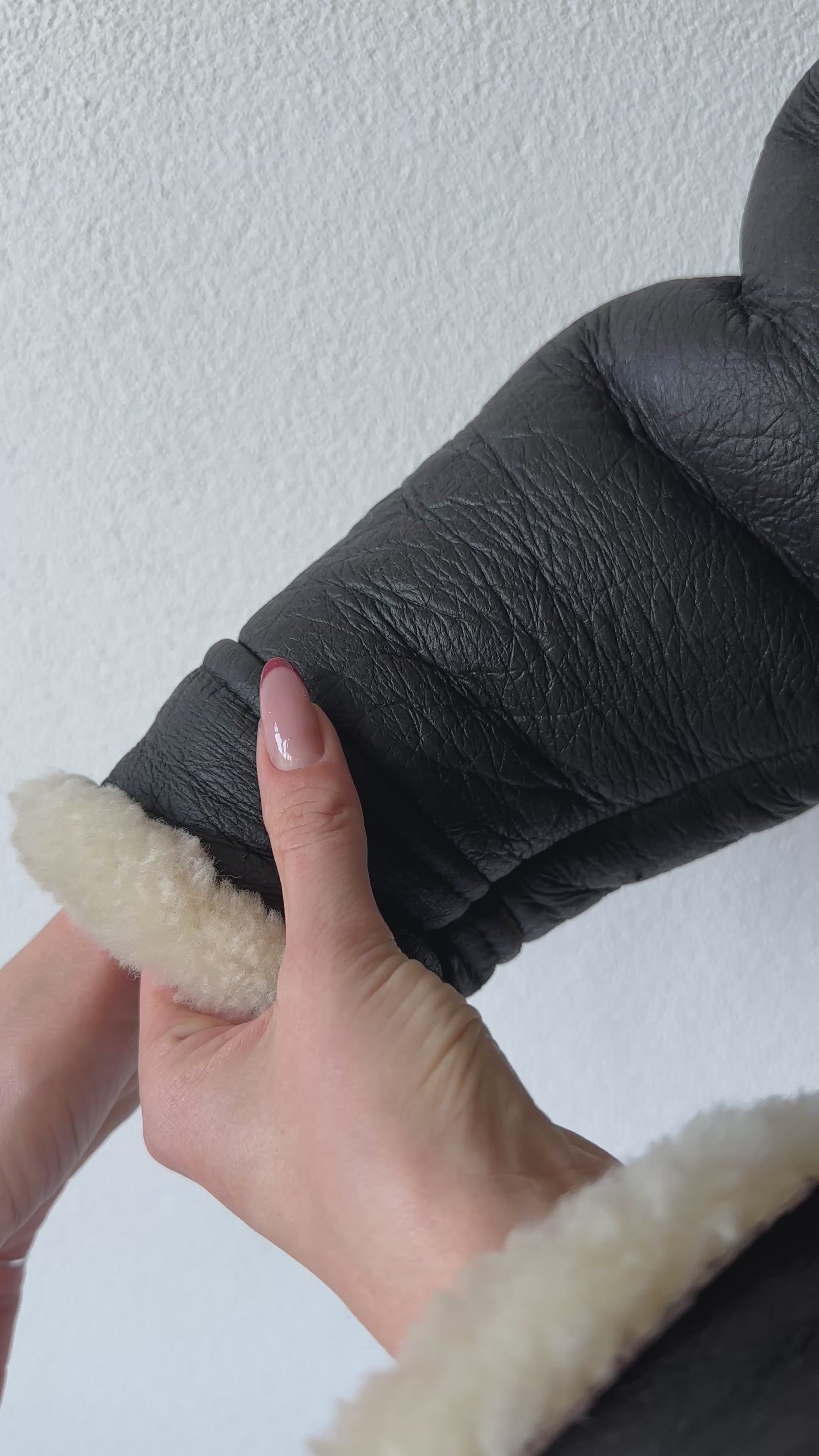 This black shearling lammy coat is a true winter statement with a soft and inviting contrast.