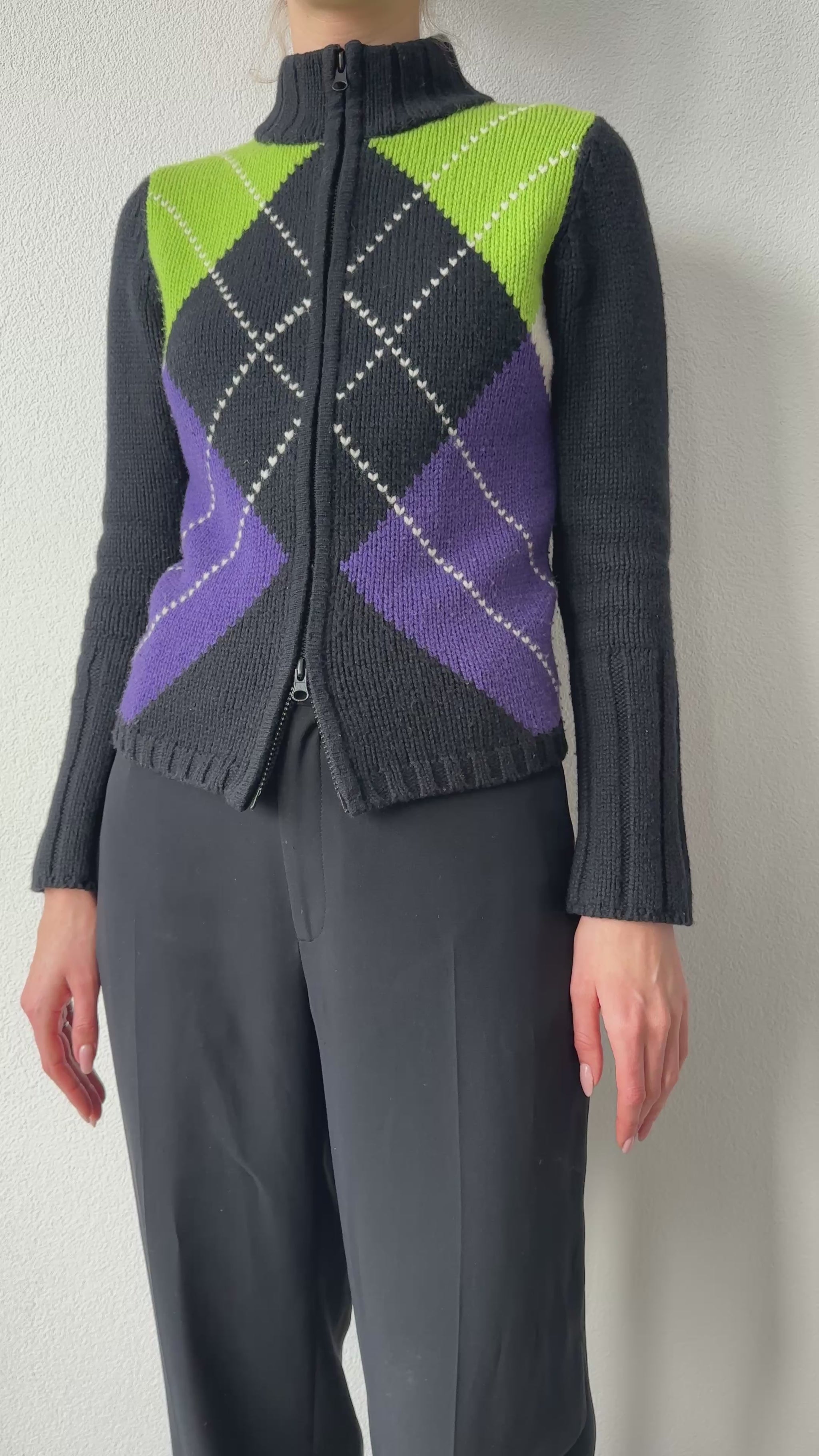 This wool zip-up cardigan stands out through its beautiful diamond pattern in black, purple and green.