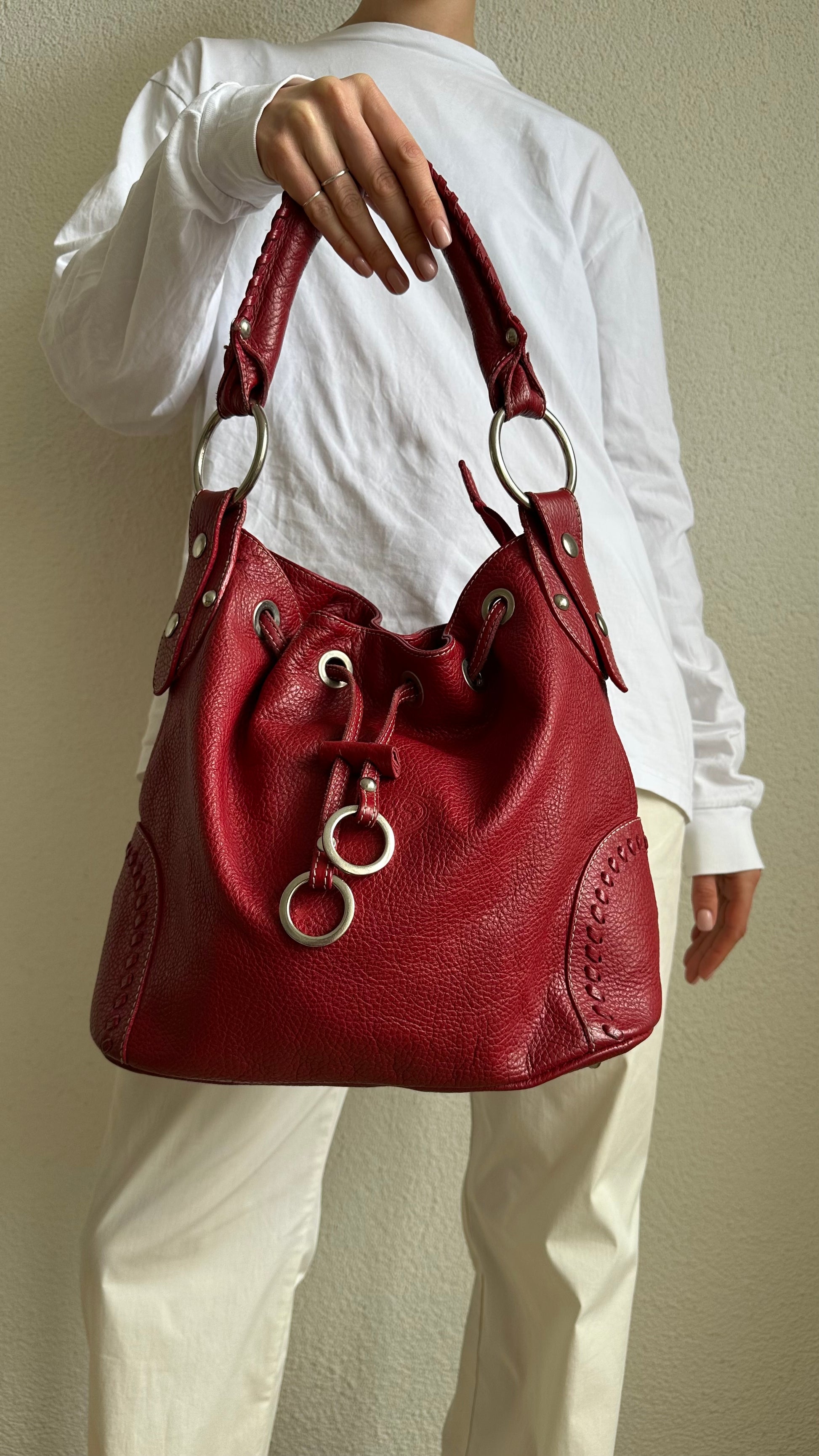 This Tods red leather bucket bag is a true statement of craftsmanship and timeless design.