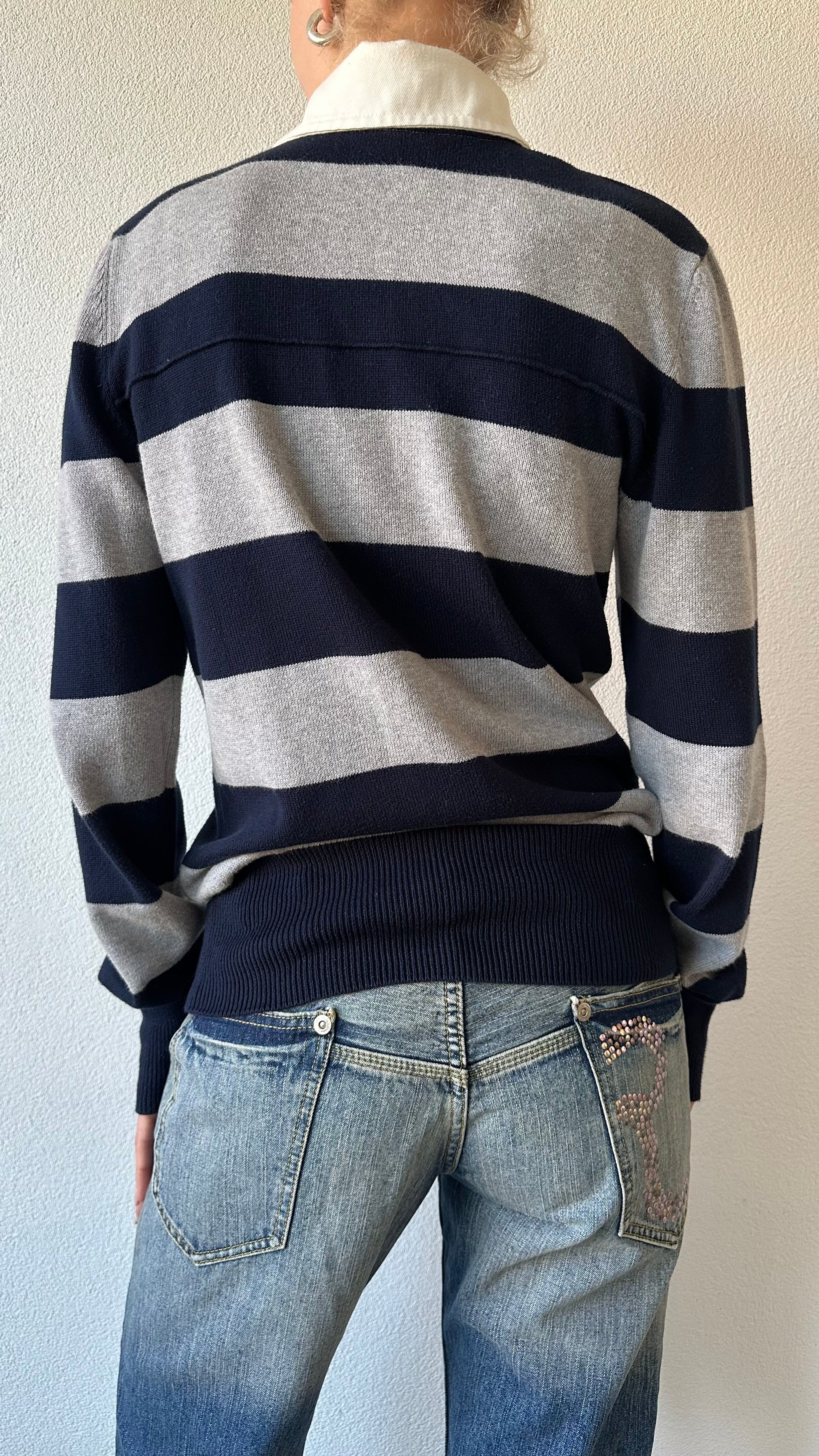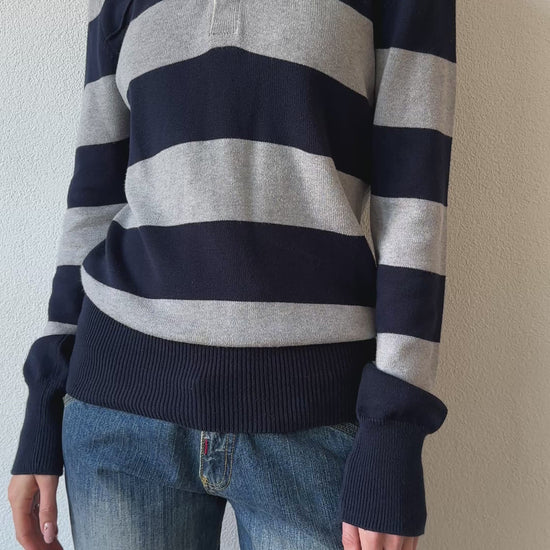 Its muted grey and blue stripes create a subtle and easy to style color palette that works with almost anything. The fit has that perfect vintage ease, not too oversized but relaxed enough to layer over a shirt or under a coat. It is ideal for transitional weather when you want something cozy but not too heavy. The soft knit makes it extra comfortable while the collar adds a refined touch that keeps it from feeling too casual.