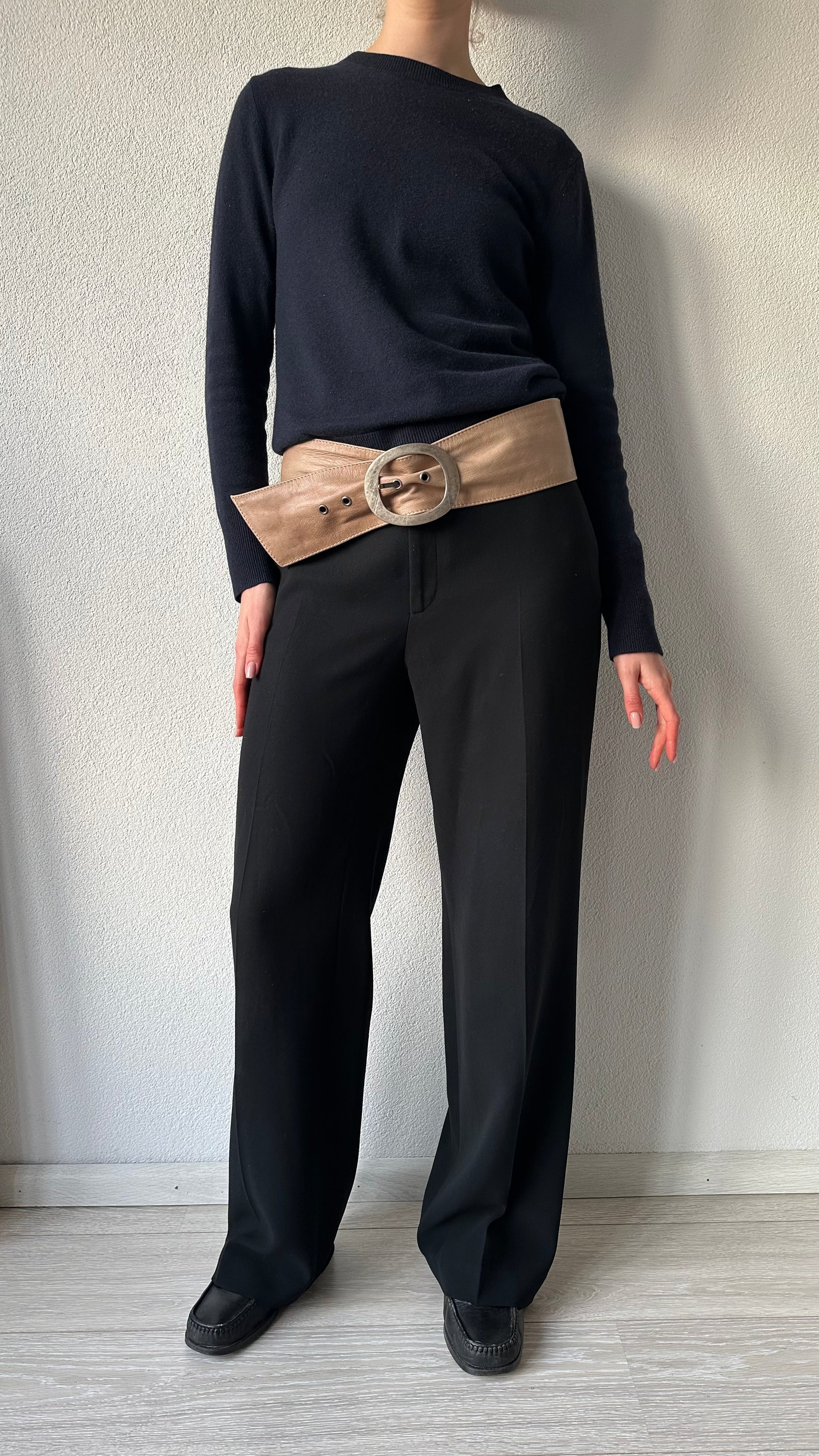 This wide vintage leather belt in beige is a timeless accessory that instantly pulls an outfit together.