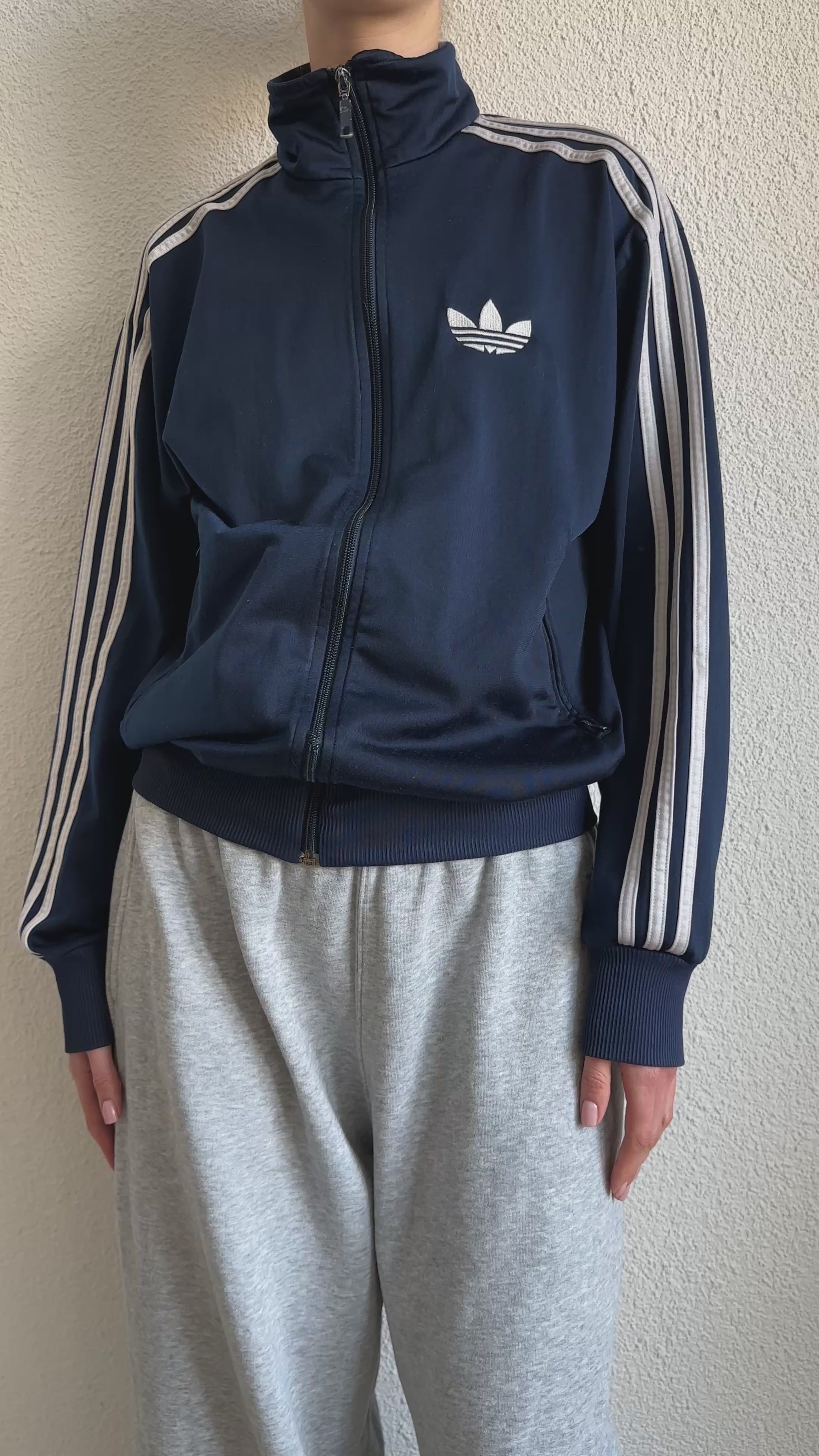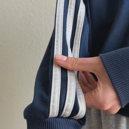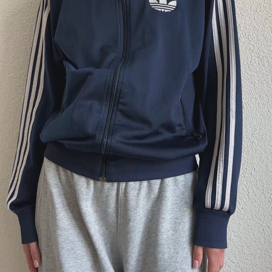 This blue Adidas zip up vest is a true sporty classic. The deep blue tone combined with the iconic Adidas details gives it that authentic vintage sportswear feel.